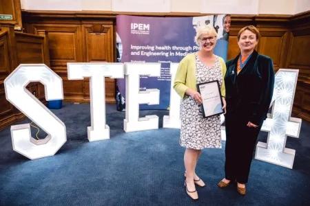 Professor Carmel Moran was awarded the Spiers' Prize for Outreach at STEF 2024. Carmel Moran (left) receives the Spiers' Prize for Outreach at the STEF'24 conference STEF is the annual Science, Technology, and Engineering Forum held by the Institute of Physics and Engineering in Medicine (IPEM). STEF'24 was held in October this year.The Spiers' Prize for Outreach is awarded to people who have improved education or raised awareness of medical physics and engineering through outreach activities. IPEM's Prizes and Awards Committee were unanimous in their decision to give Carmel and her team the award for her engagement activity 'Imaging Inside Out'.Carmel designed this activity for secondary school pupils and co-created it with teachers. Imaging Inside Out aims to reveal how imaging and physics techniques are applied in clinical and preclinical (animal) settings to learn more about health and disease. The activity was judged by the committee as highly likely to leave a positive and lasting impact on students who take part.Related linksSTEFCarmel MoranCentre for Cardiovascular ScienceEdinburgh ImagingSocial media tags and titlesProfessor Carmel Moran was awarded the Spiers' Prize for Outreach at STEF 2024.@EdinUniImaging @EdinUniCVS This article was published on 2024-12-17